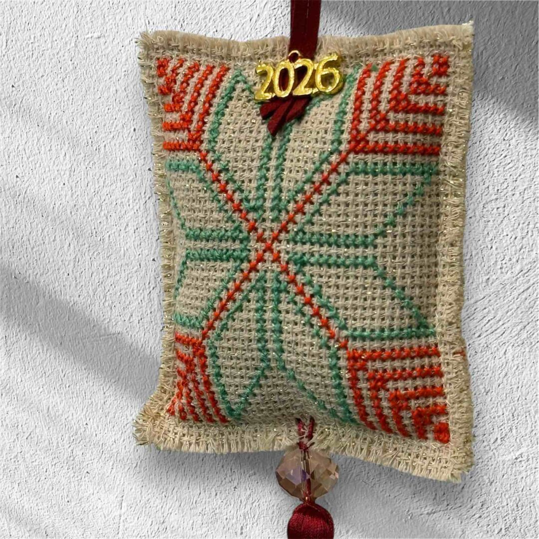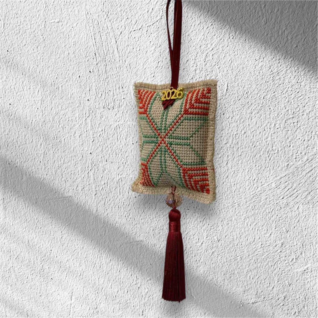 Χειροποίητο γούρι με βελονάκι πλεγμένο στο χέρι σε τελείωμα με μουράνο χάντρα και μεταξωτή φούντα, Ραμμένο πάνω του είναι επιχρυσωμένο στοιχείο το 2026 για την καινούργια χρονιά