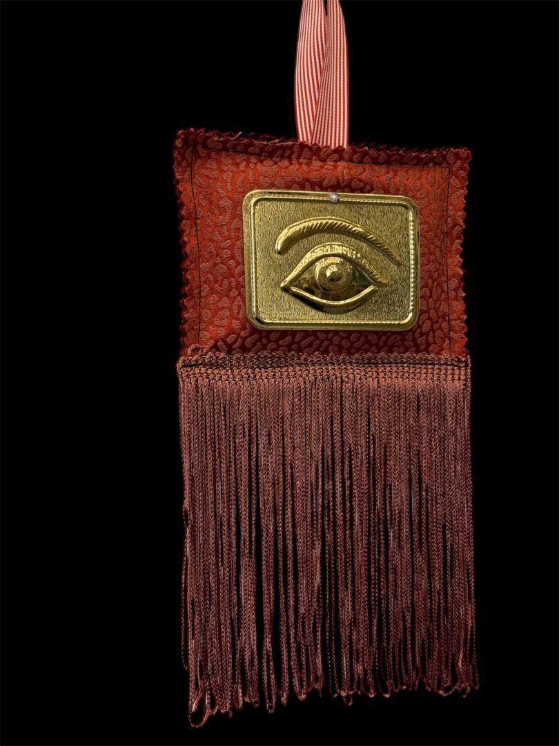 Υφασμάτινο γούρι χειροποίητο που στο κέντρο του κοσμεί επιχρυσωμένο αντίγραφο τάματός. Που συμβολίζει μάτι, επιτοίχιο με μεταξωτό Μπορντό κρόσι.