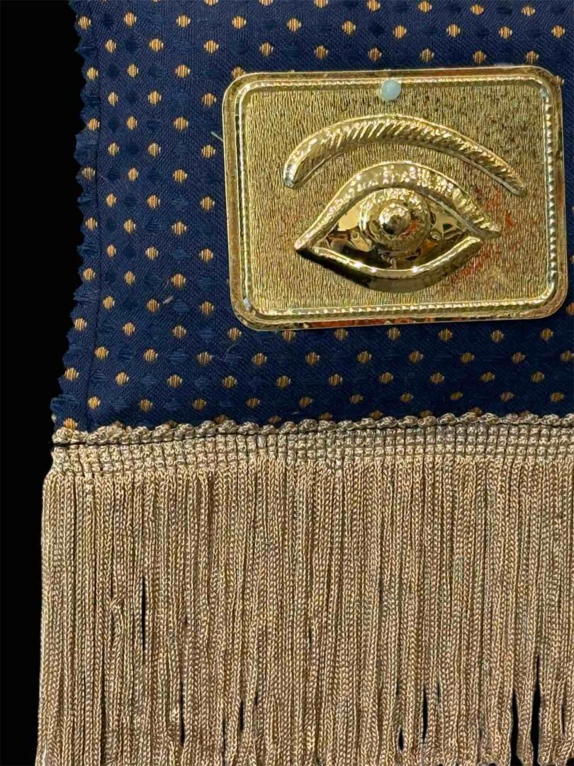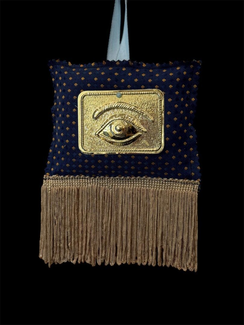 Χειροποίητο Γούρι σε Μπλε αποχρώσεις υφάσματος στο κέντρο του τάμα με μάτι και τελειώνει με μεταξωτά κρόσια.