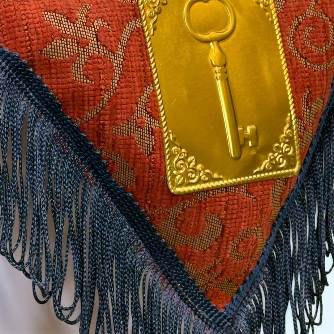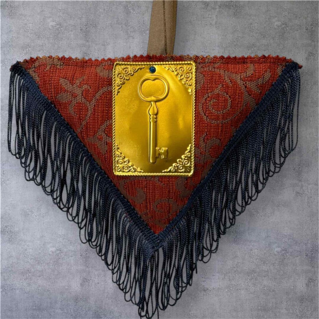 Σε τριγωνικό ιδιαίτερο σχήμα ραμμένο στο χέρι, στο κέντρο του συμβολίζεται ένα περίτεχνο σφυρήλατο κλειδί σε στυλ τάματός